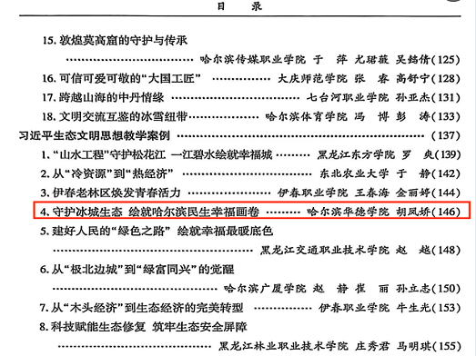 在省教育厅组织的习近平生态文明思想教学案例征集工作中,学院胡凤娇老师的《守护冰城生态 绘就哈尔滨民生幸福画卷》案例,成功入选黑龙江省高校思政课教学案例库,胡競兮老师参与了微课视频的录制工作。与此同时,在省级“大思政课”实践教学精品课程遴选中,学院徐程老师团队的《以爱国主义为核心的民族精神是中国人民抗日战争的决定因素》课程,入选了省级“百节精品课程”。