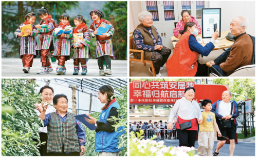 新时代以来,我国幼有所育、学有所教、劳有所得、病有所医、老有所养、住有所居、弱有所扶不断取得新进展,人民群众获得感、幸福感、安全感更加充实、更有保障、更可持续。左上图为领到新书的瑶族学生一起交流(新华社记者 杨文斌/摄),右上图为老人在护理中心测量健康数据(新华社记者 朱峥/摄),左下图为政务服务站工作人员为瓜农办理社保业务(新华社记者 李欣/摄),右下图为领取新房钥匙的一家三口走进改造后的小区(新华社记者 方喆/摄)。
